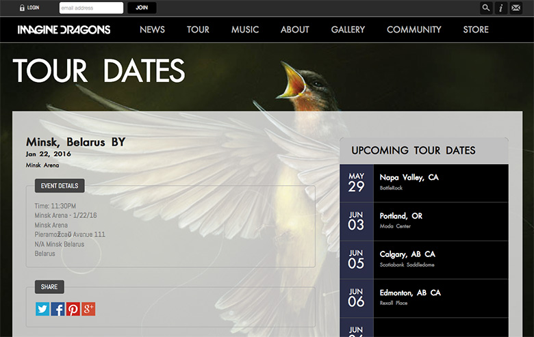 Одна из самых популярных групп современности сообщила у себя на сайте, что 22 января 2016 года даст концерт в «Минск-Арене».