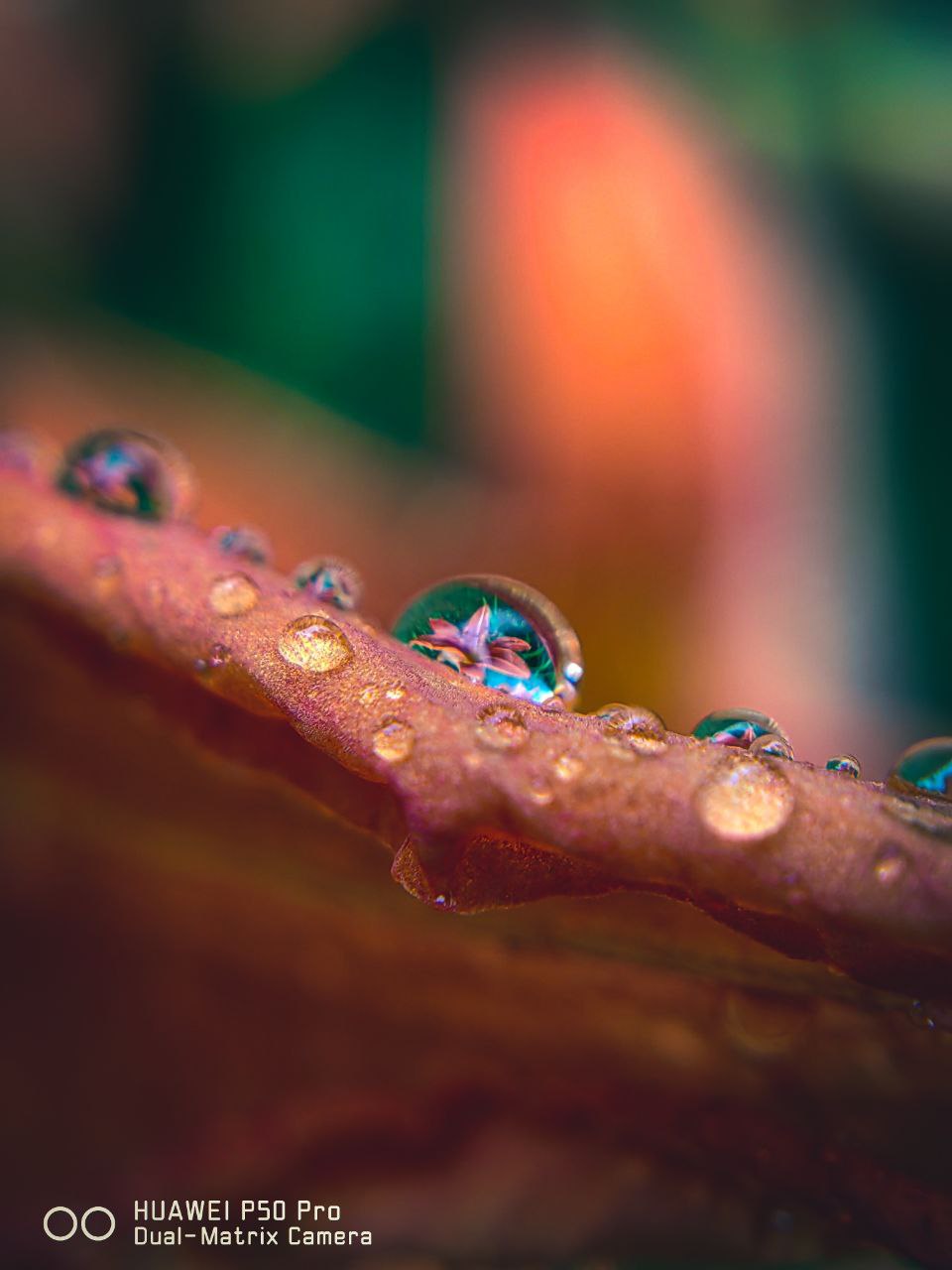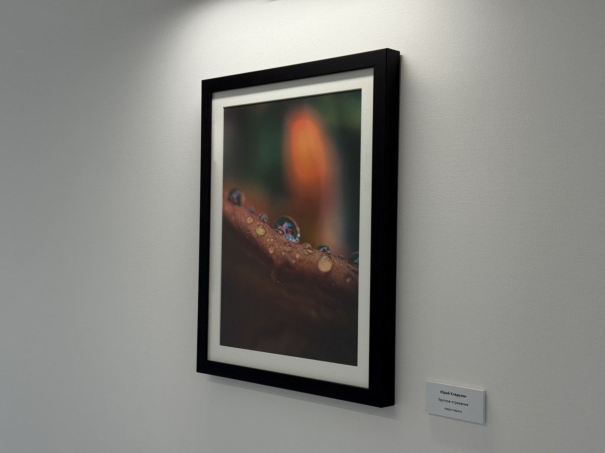 Именно на Huawei P50 Pro и был сделан снимок, с которым сейчас могут ознакомиться посетители Третьяковской Галереи. На нем запечатлены несколько капель воды, внутрь которых будто бы попал миниатюрный цветок. Но на самом деле это просто отражение – сам цветок находится чуть поодаль. На фото можно увидеть его едва заметный силуэт. Работа получила название «Хрупкое отражение».