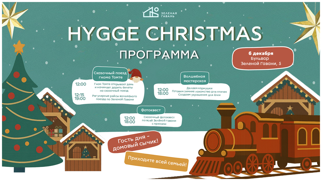 В Зеленой гавани 6 декабря пройдет первый праздник в стиле Hygge Christmas. На репетицию Рождества и Нового года зовут всех желающих. В программе – бесплатные экскурсии на паровозе в компании гномов Томте, встреча с настоящим сычом, мастер-классы и сказочный квест с подарками.