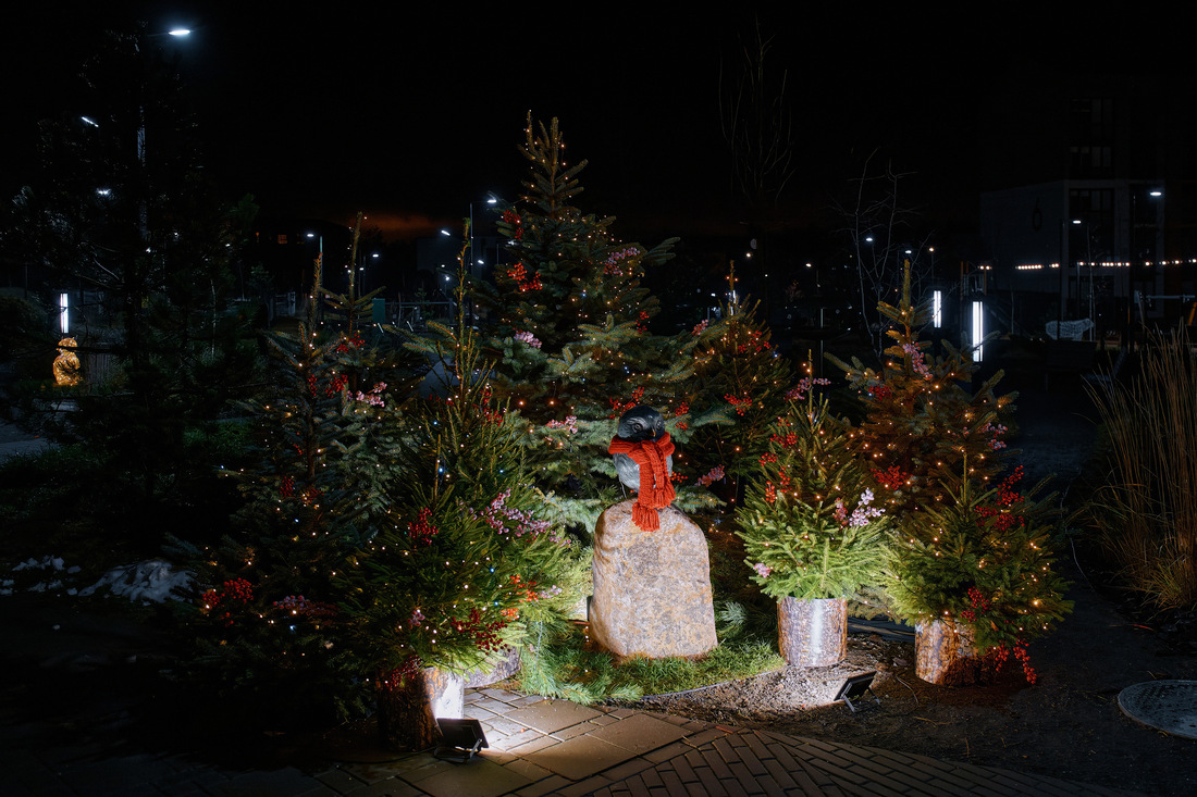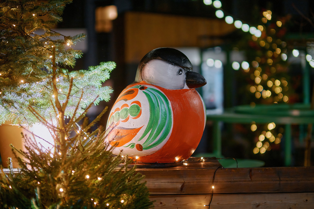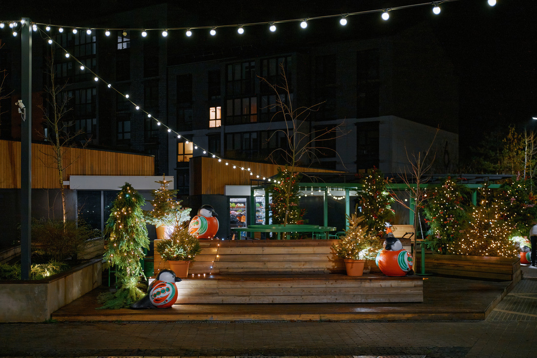 Зеленая гавань еще днем превратится в сказочный городок, а вечером зажгутся световые инсталляции. Колорит создаст новогоднее оформление: скандинавская лошадка Dala, пышные ели, фигуры снегирей и других лесных обитателей.
