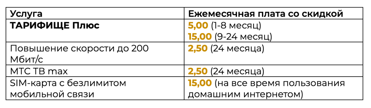 К базовому пакету легко добавить опции: скорость до 200 Мбит/с, МТС ТВ с более чем 120 каналами и до 3-х SIM-карт с безлимитной мобильной связью. Все оборудование — роутер и ТВ-приставка — обойдется в символическую стоимость по 1 рублю.