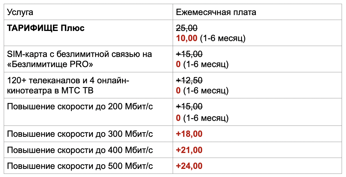 Домашний интернет на скорости до 500 Мбит/с доступен на «ТАРИФИЩЕ Плюс». Услуга-конструктор позволяет самостоятельно выбирать необходимую скорость, а также в любой момент подключать дополнительные опции, не переплачивая за ненужные сервисы. Пользователи могут добавить в единый пакет до 3-х номеров с безлимитной мобильной связью, подписку на МТС ТВ и антивирус Kaspersky.