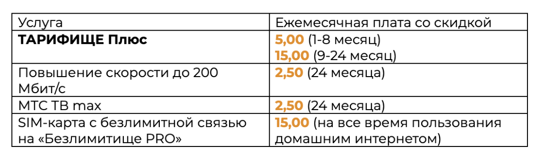 К базовому интернету до 100 Мбит/с доступны дополнительные опции: увеличение скорости, более 120 каналов в МТС ТВ, а также до 3-х номеров с безлимитной мобильной связью и возможностью подключить скидку 100% на раздачу трафика в режиме модема.