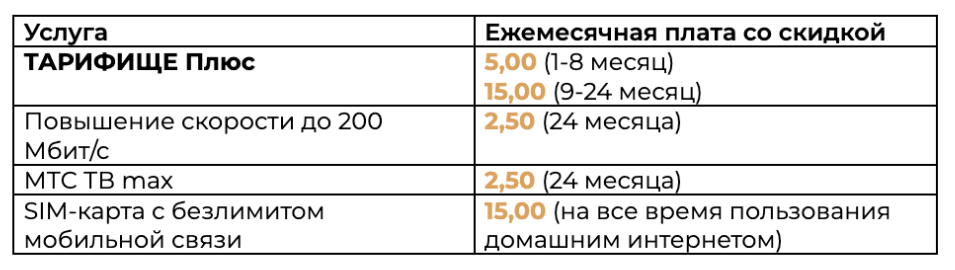Абоненты могут собрать индивидуальный пакет услуг без переплаты за лишние опции. Базовый интернет-доступ на скорости до 100 Мбит/с можно дополнить выгодными предложениями: увеличить скорость до 200 Мбит/с, активировать более 120 телеканалов в МТС ТВ, а также подключить до 3-х SIM-карт с безлимитным мобильным интернетом и звонками во все сети Беларуси.