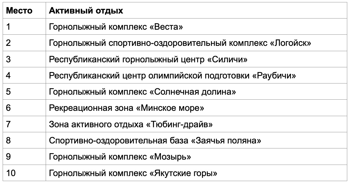 Лидером среди спортивных объектов стал горнолыжный комплекс «Веста» в Дзержинском районе. Самую длинную тюбинговую трассу страны (259 м) и другие зоны отдыха за зиму посетили более 81 тысячи абонентов. В тройку вошли также «Логойск» и «Силичи» — сеть оператора зафиксировала здесь почти по 50 тысяч уникальных пользователей.