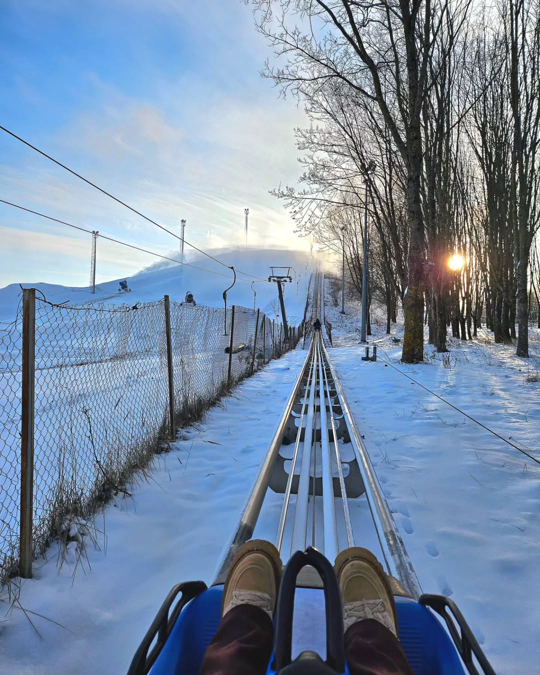 Кататься на нем можно без подготовки и снаряжения, а экстремальных эмоций - шквал! По сути, вы едете по длинной горке на рельсах в санях на скорости до 45 км/ч и орете. И все это - за 6 рублей! Горка (ее длина - 425 метров) работает и летом, и зимой. Больше в Минске таких аттракционов нет.
