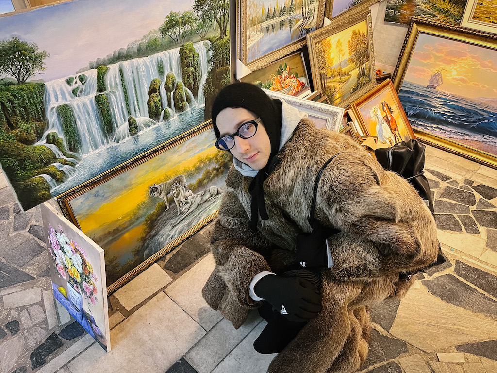 Дальше мы просто ходили и глазели. А в конце коридора нам встретился приятный совсем не дед по имени Олег. У него в колонке играл трек Джорджа Майкла «Careless Whisper». Олег продает свои картины, в основном пейзажи, и картины жены – в основном собак в шапках. Парень спросил, почему так много художников «Вернисажа» рисуют пейзажи, и Олег пояснил: «Классика всегда была, есть и будет. Березки, речушка – это жизнь».