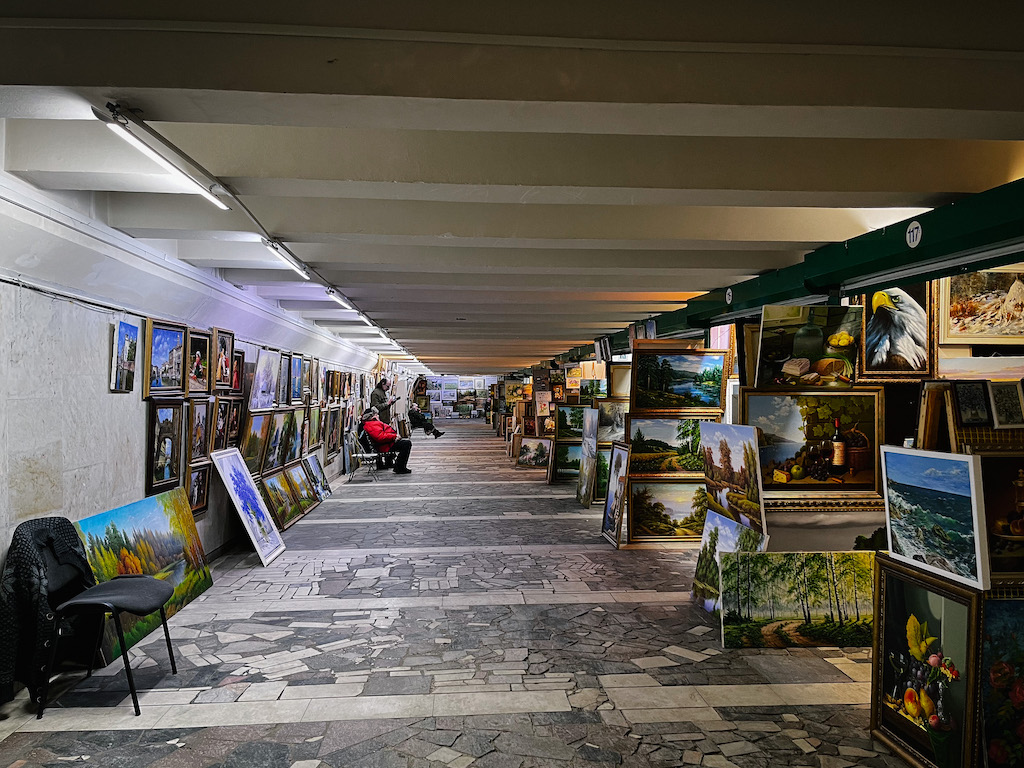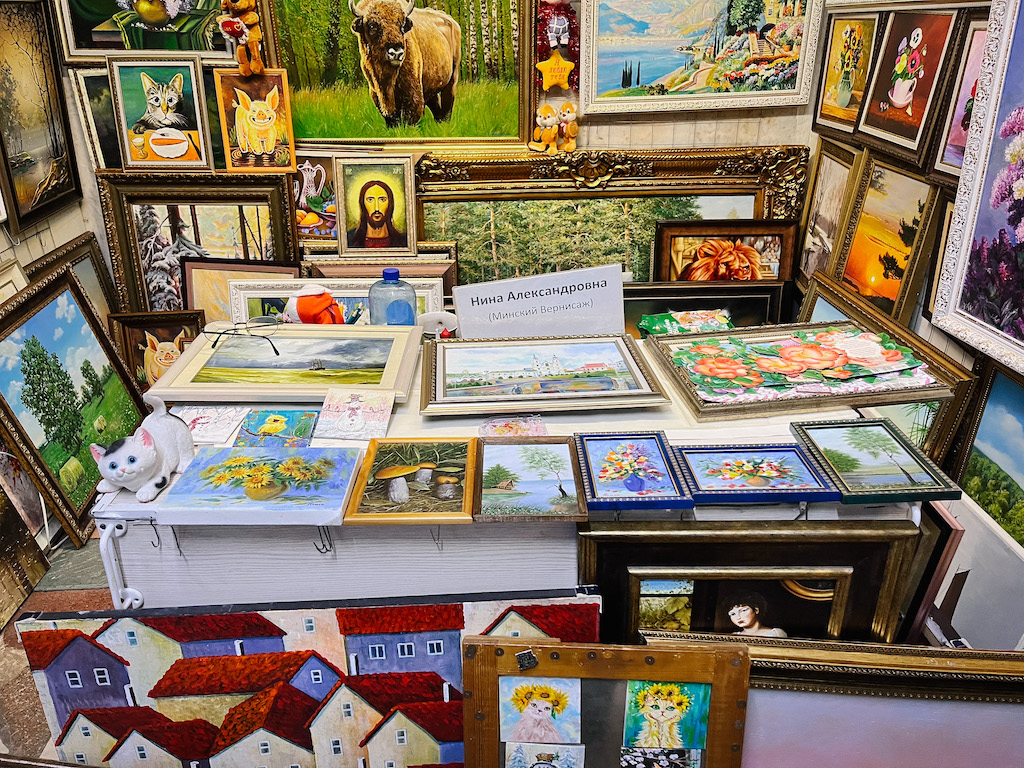 Что такое ТЦ «Купаловский»? Это место, где можно бесплатно посмотреть ИИ-картины, которые почему-то нарисовали живые люди. Поражает, что это до сих пор существует и пережило миллион заведений получше! Пространство представляет собой что-то типа: ремонт обуви, зарядки для телефонов, пару книжных и еще пару винтажных магазинов, а потом коридор с картинами и художниками на раскладных стульях. Мы проходили экскурсию именно в таком порядке.