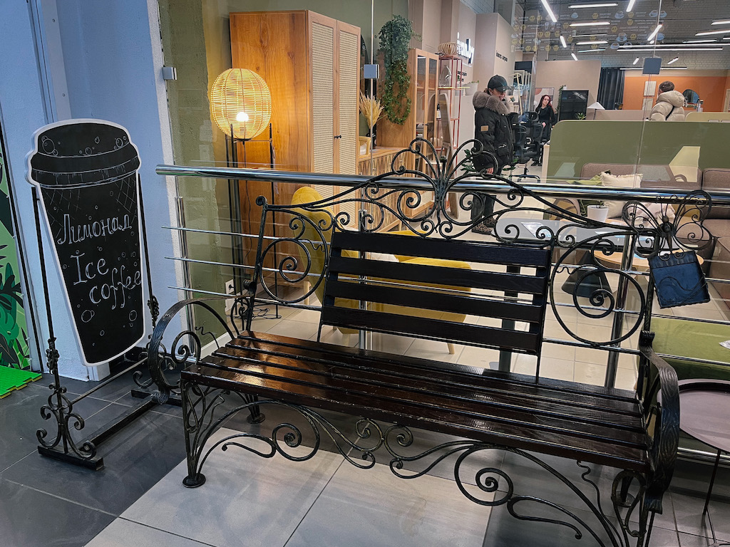 На выходе из интерьерной стоит единственная живая, не автоматная точка с кофе на весь All House и деревянные лавки с коваными завитками. Перед тем как проделать тот же путь обратно, мы присели на дорожку и немного отдохнули.