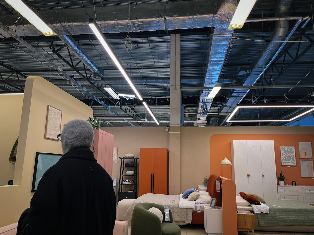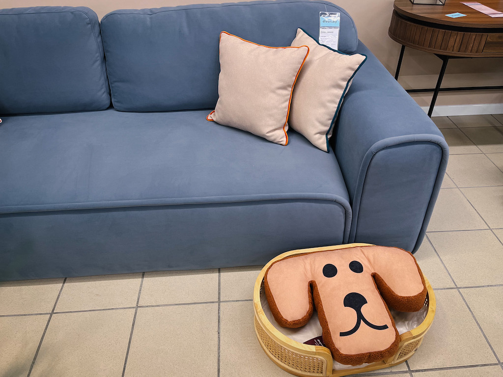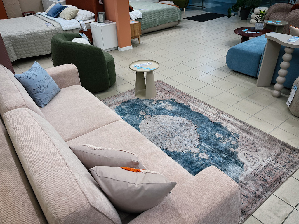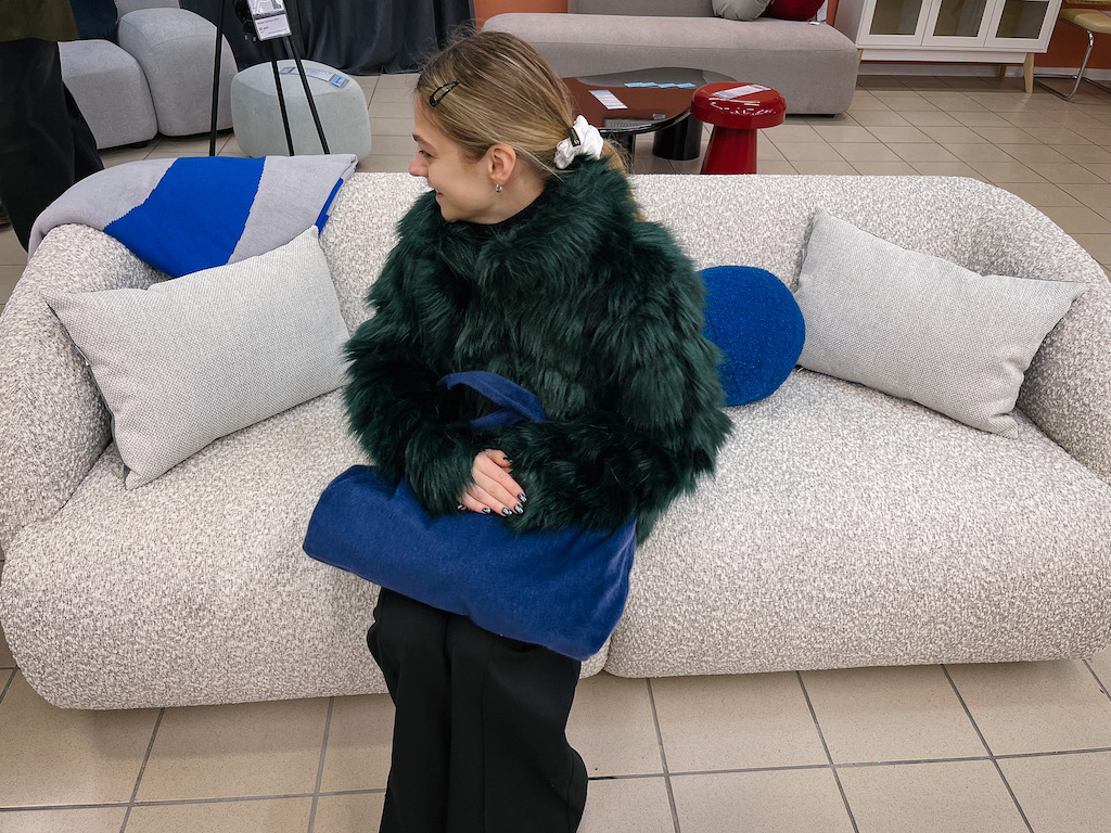 Внутри небольшого пространства ощущаешь себя в декорациях ситкома для дофаминового поколения: яркие пуфы, плюшевые кресла, мебель без углов и причудливых форм. Парню понравился журнальный столик за 700 рублей, а потом он еще спросил, есть ли он в цвете орех. Я просто тихонечко стояла рядом.