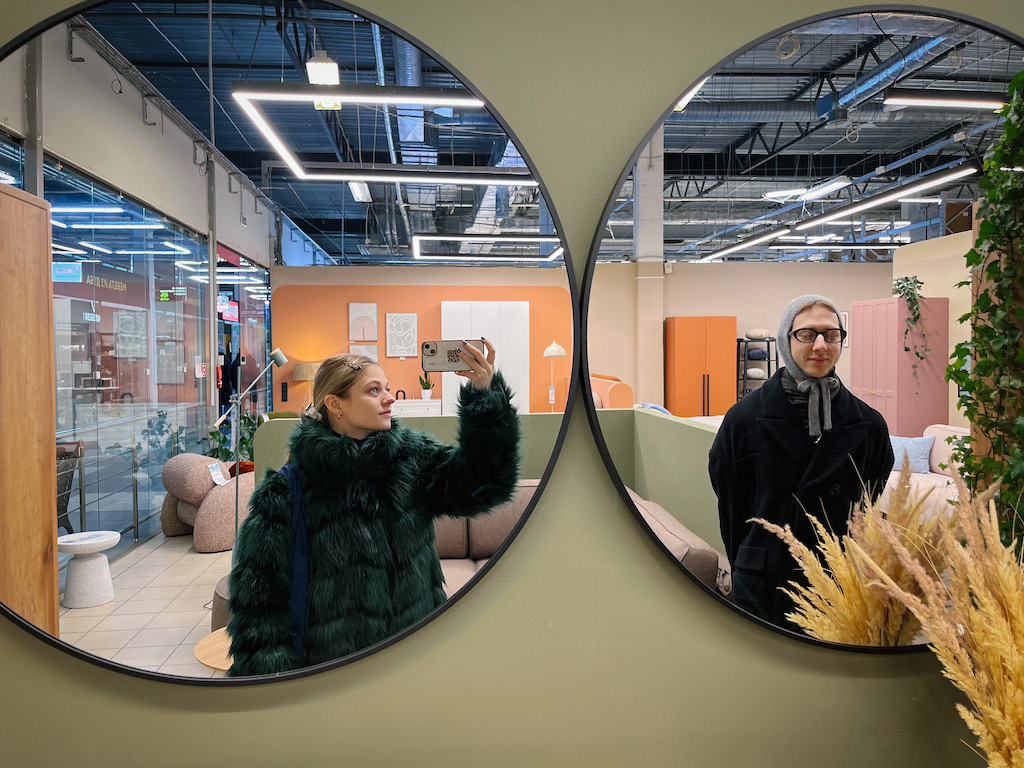 После того, как с нами поздоровались и проконсультировали по столу, я осмелела: сидела на диванах и креслах, открывала все ящики и проверяла, что внутри. Стоит сказать, что мы не лежали на кровати, как это было в фильме, но нам никто и не запрещал. Вместо этого фотографировались в зеркалах, и я уговаривала парня поставить дома лавку, чтобы друзья приходили в гости и сидели. Убеждать его в клевости этой идеи оказалось сложно. Он хочет, чтобы друзья сидели на диване.
