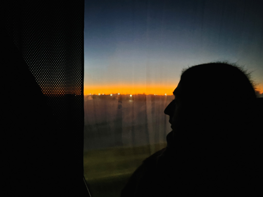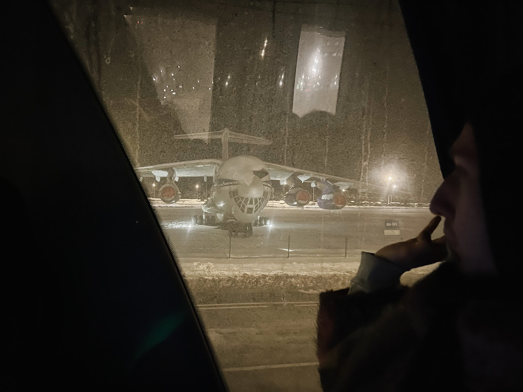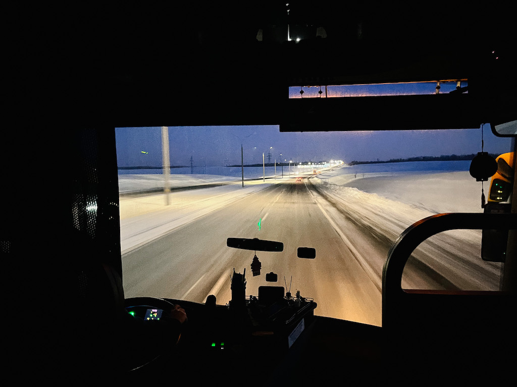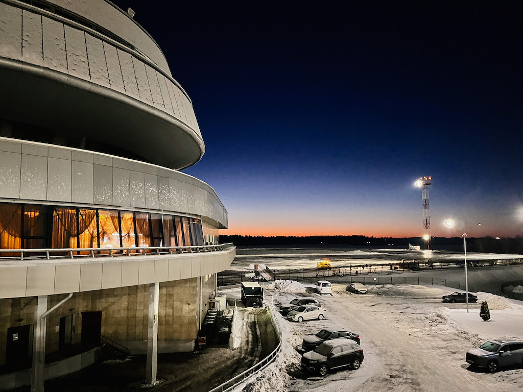 Купили билеты в кассах внутри вонючего автовокзала, но можно было купить и сразу у водителя. За нами приехал туристический автобус №300Э. Был очень морозный день, а в автобусе стало сразу тепло. Мы болтали и ели клюкву в сахаре. В аэропорт приехали прямо к закату и сразу побежали его провожать.