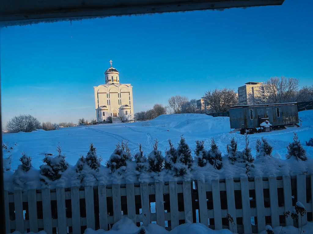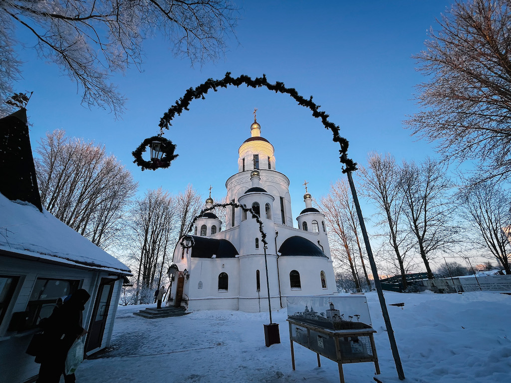 Сели на 92 троллейбус и доехали до остановки Чижовка-6. Кто-то скажет: Богом забытое место. Но вообще прямо у остановки стоит Георгиевский храм. На территории храма находится популярная Георгиевская кофейня. Летом тут во дворе ставили проектор и показывали фильмы. Я ходила на «Красавицу и Чудовище», где перед показом выходил священник и говорил, что это очень христианская история.