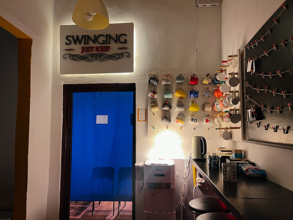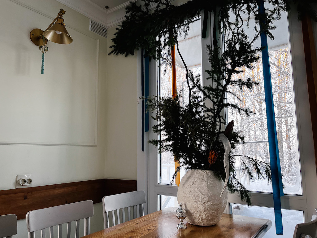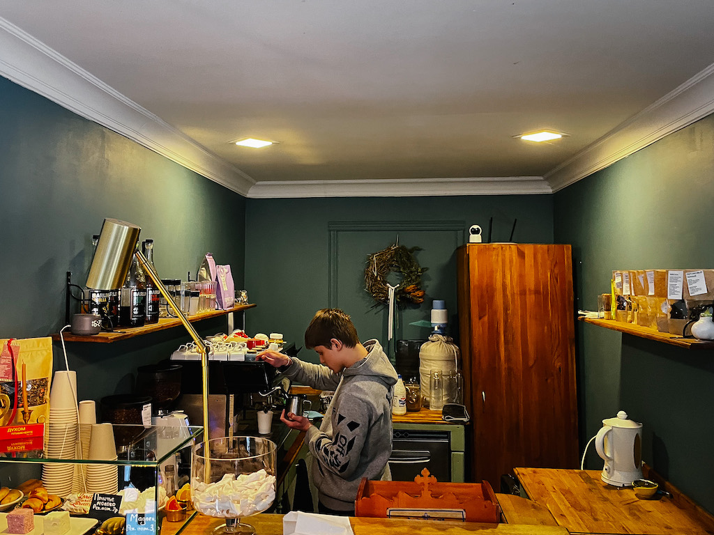 Внутри кофейни есть пару столиков на двоих и один большой и красивый стол для компании. Периодически сюда заходят священники, говорят: «Сделайте нам кофейку и мы пойдем помолимся». Из окон с одной стороны открывается вид на церковь Минской иконы Божией Матери. C другой стороны – храм, который еще только строится и ощущается как у Балабанова в «Я тоже хочу».