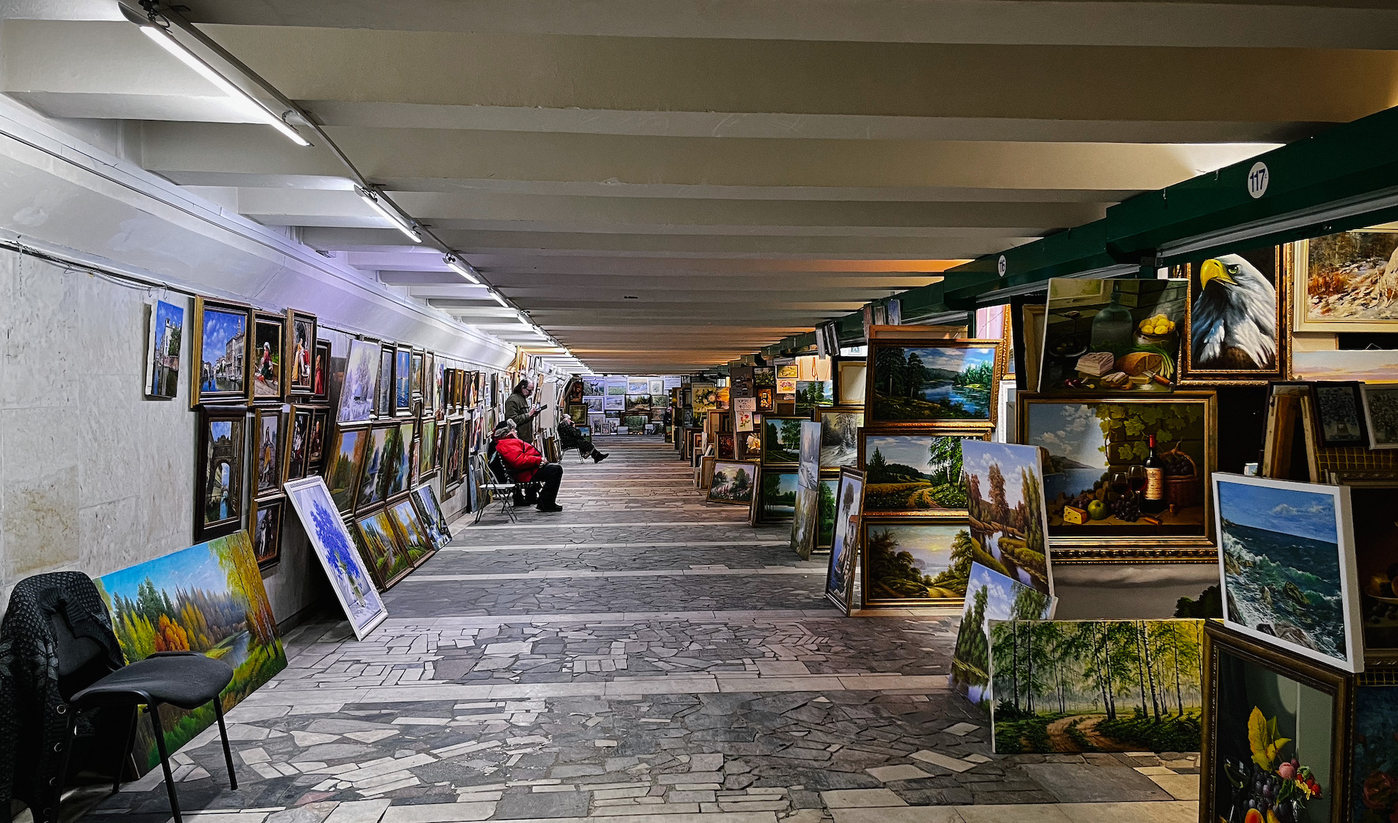 В конце коридора встретился приятный совсем не дед по имени Олег. У него в колонке играл трек Джорджа Майкла «Careless Whisper». Олег продает свои картины, в основном пейзажи, и картины жены – в основном собак в шапках.